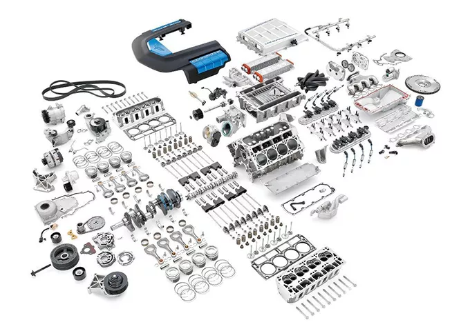 The different parts that make up your car's engine consist of: the engine block (cylinder block), the combustion chamber, the cylinder head, pistons, the crankshaft, the camshaft, the timing chain, the valve train, valves, rocker arms, pushrods/lifters, fuel injectors, and spark plugs.